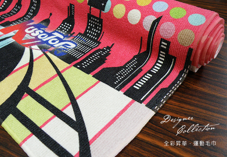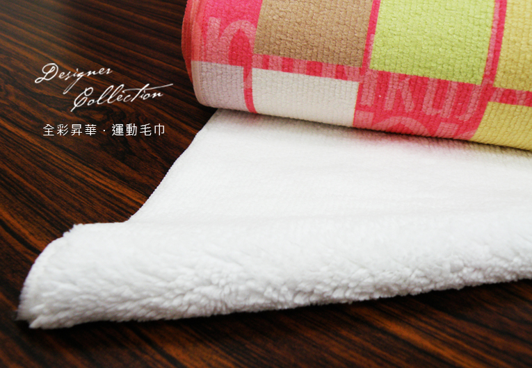 全彩昇華運動毛巾採用超細纖維毛巾印製,材質為化學纖維與尼龍,不含任何化學藥物成分,直接將油墨氧化後滲入纖維中,色彩豐富鮮豔且耐洗不易褪色。接受客製化少量訂單,多種尺寸可供選擇,並有公版圖案可供選購。